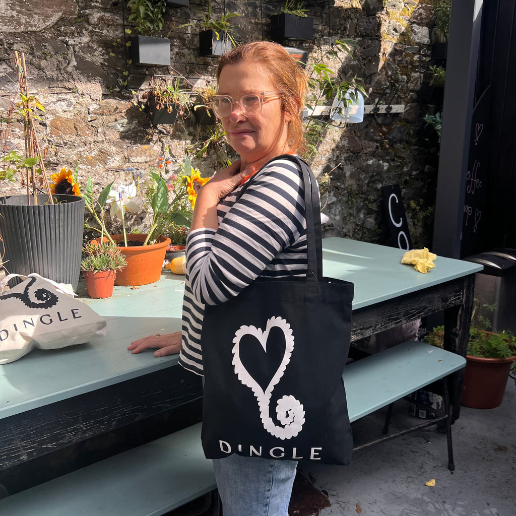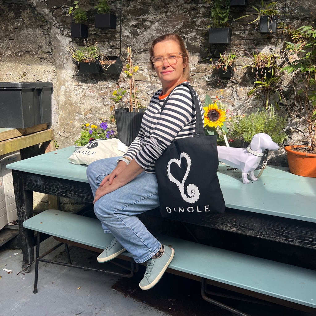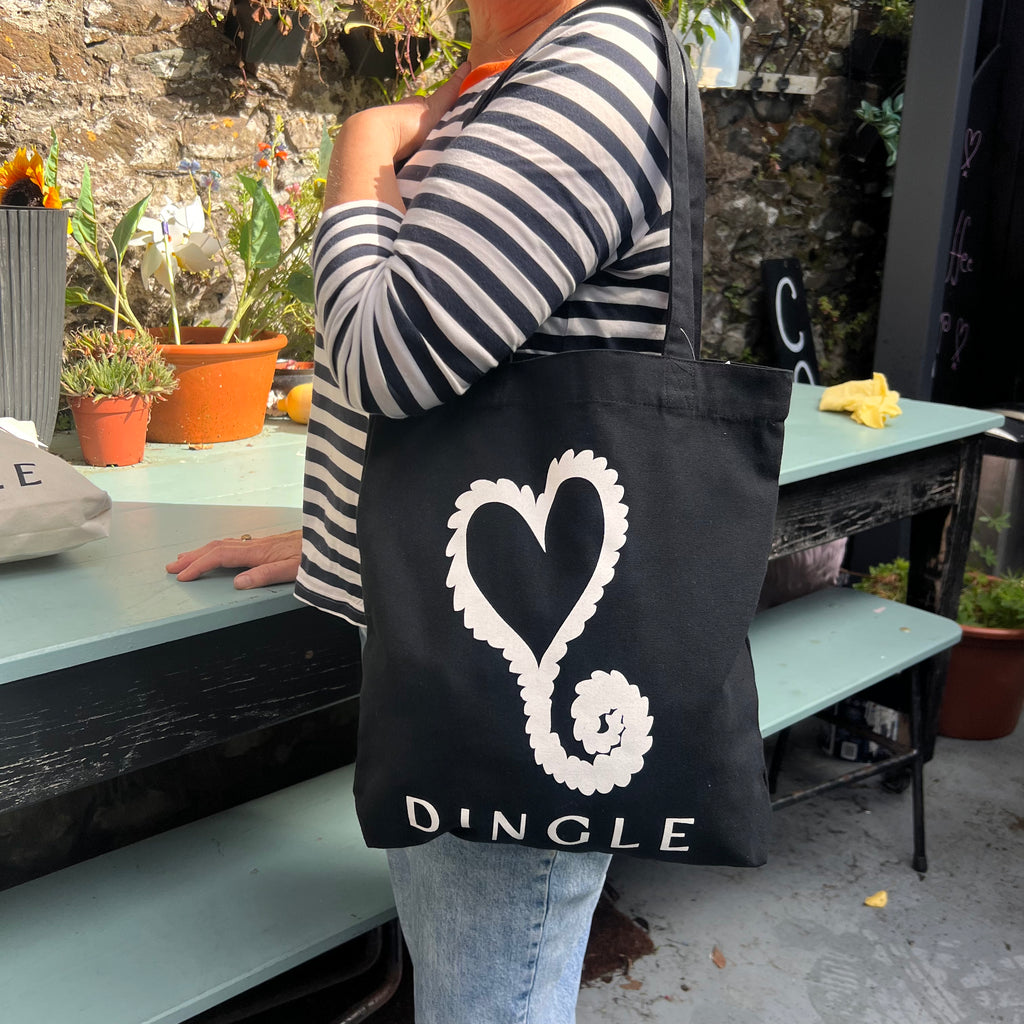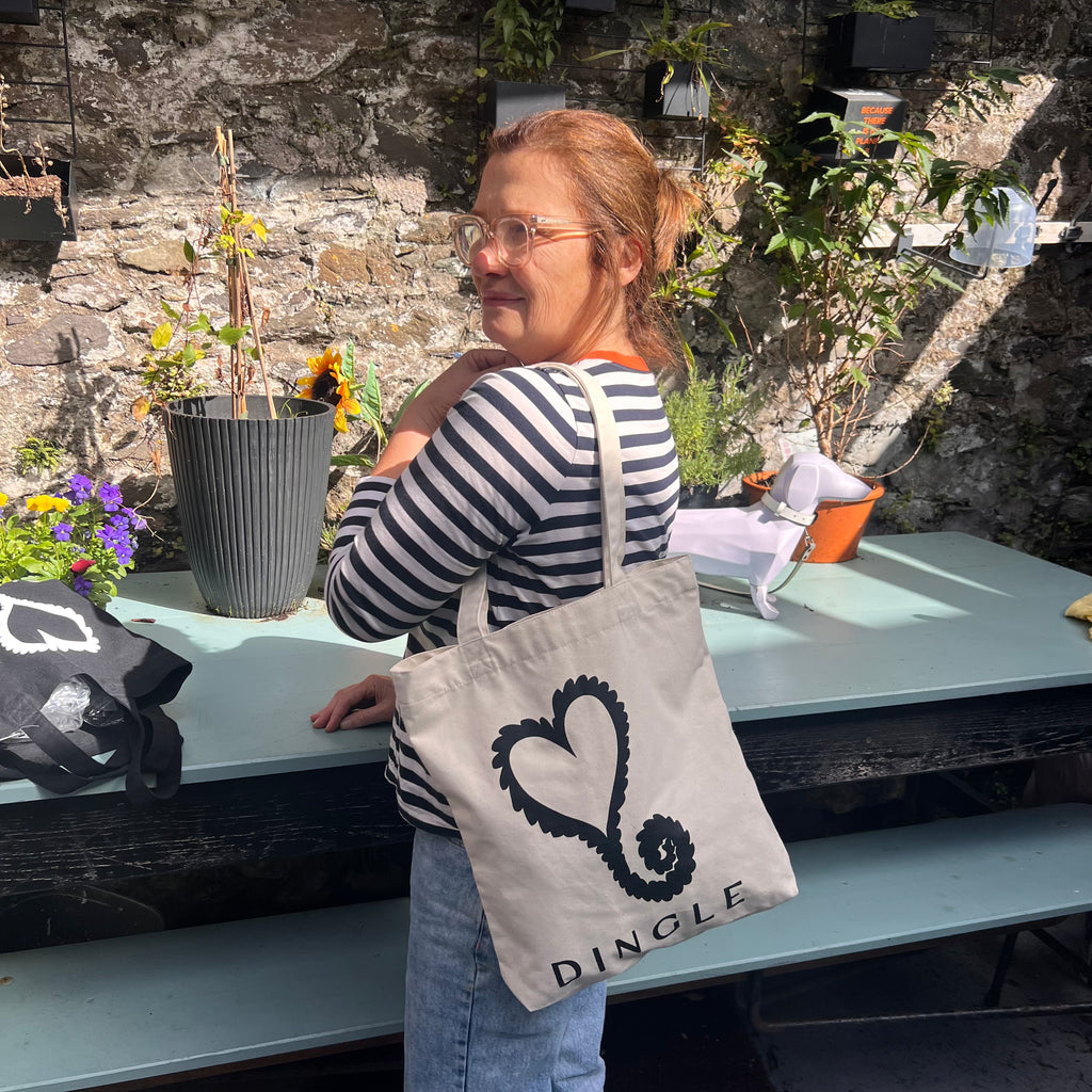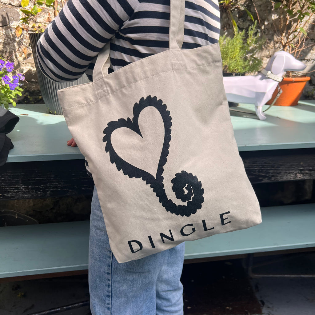 Carry a piece of Dingle with you wherever you go. The Kathleen McAuliffe Dingle Tote Bag, crafted from organic cotton, features the brand’s signature heart logo.