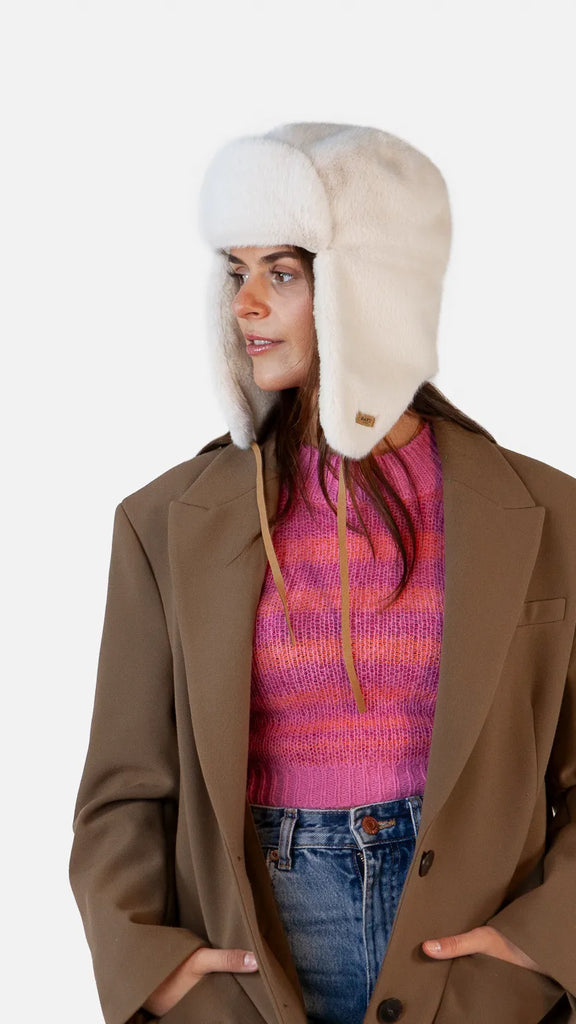 Description : The Lucerne Bomber is made of soft faux teddy fur. You can tie the faux leather straps under your chin
