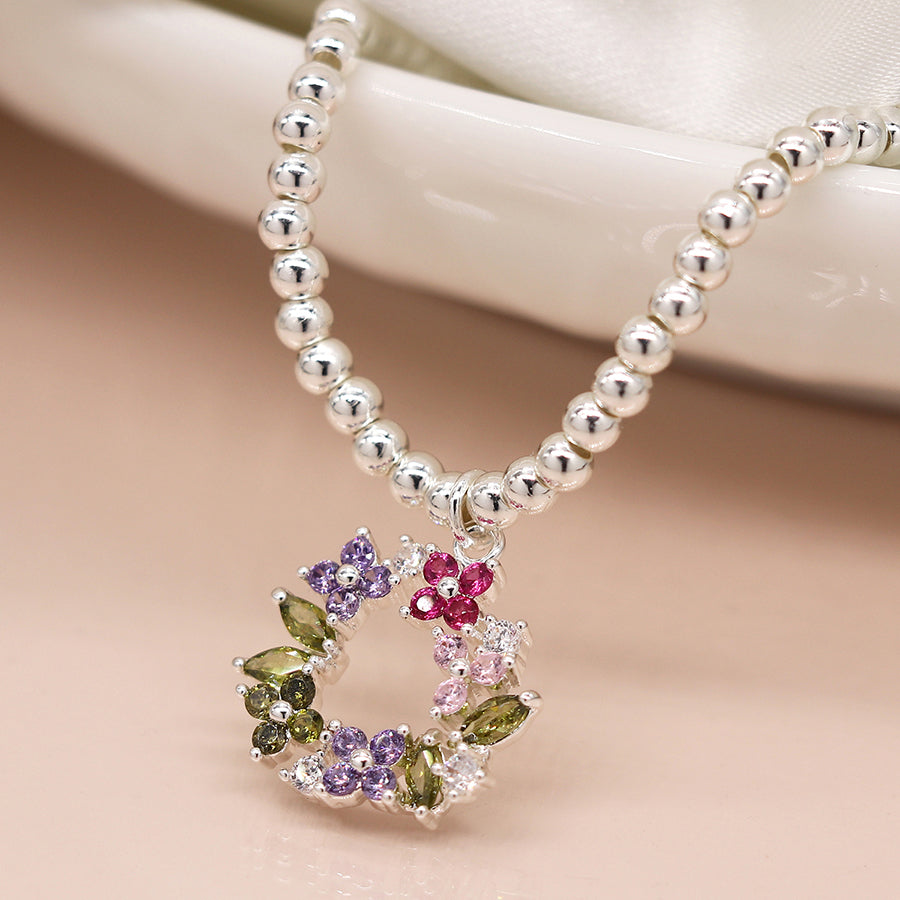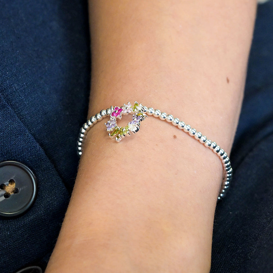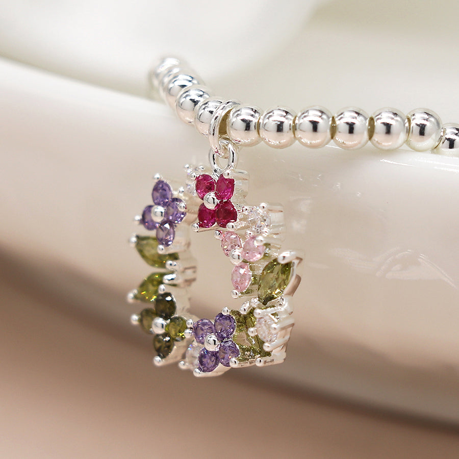 Description: Silver plated stretch bracelet with a floral circle charm featuring mixed pink, purple and green faceted crystals