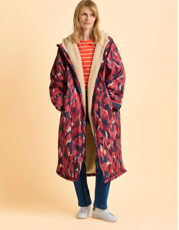 Our Almer Chinook robe is a cosy sherpa-lined, showerproof must-have featuring a vibrant watercolor design. Packed with handy outer and inner pockets, a dual zip, adjustable sleeves, and a roomy hood to keep you snug. Finished with contrasting logos and cushy padded edges, it’s the perfect sidekick for year-round beach adventures. Made from 100% polyester, it’s easy to care for—just pop it in the wash. Model is 5'9" and wears a size 8. Long sleeve, sherpa-lined, and showerproof for ultimate comfort and style.