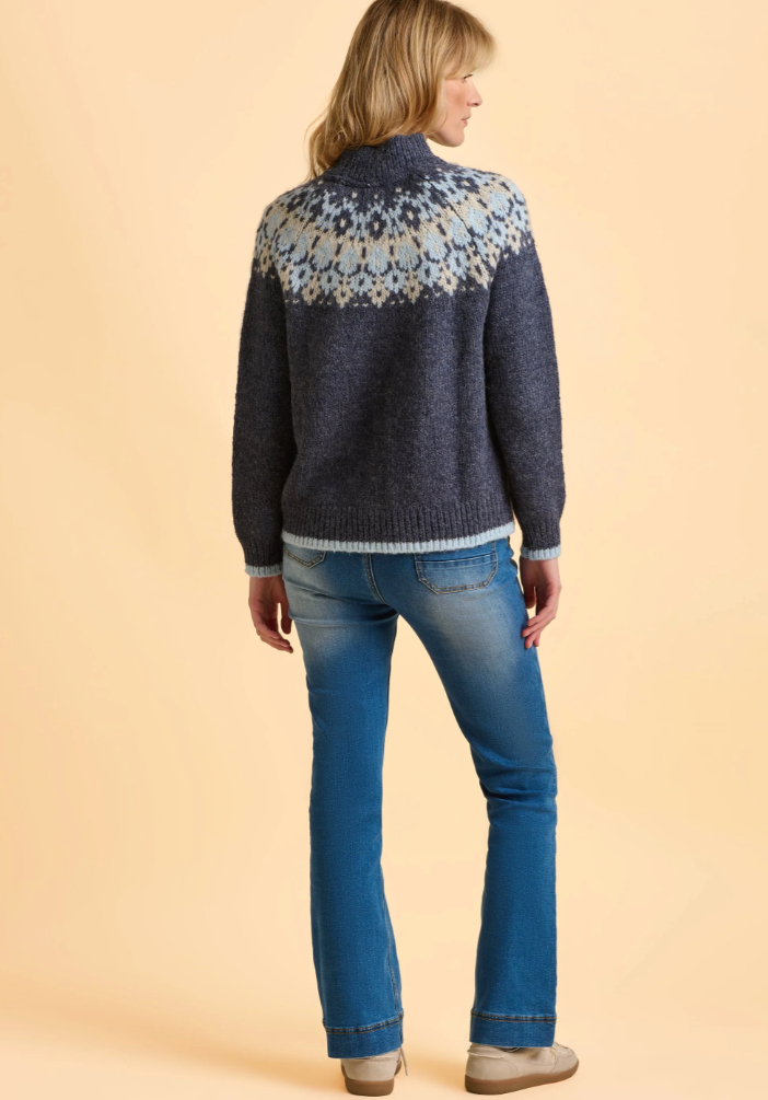 Snuggle up in this cozy knit featuring a delightful blend of wool and alpaca, perfect for chilly days. The high ribbed neckline and charming crochet-inspired pattern give it a festive twist, while the pale blue trim adds a cheeky splash of color. Medium to heavyweight, it’s just right for bundling up and stepping into the season’s adventures. Made with 55% Acrylic, 30% Nylon, 8% Wool, and 7% Alpaca, plus it’s machine washable for easy care. The model is 5'9" and wearing a size 8 with long sleeves.