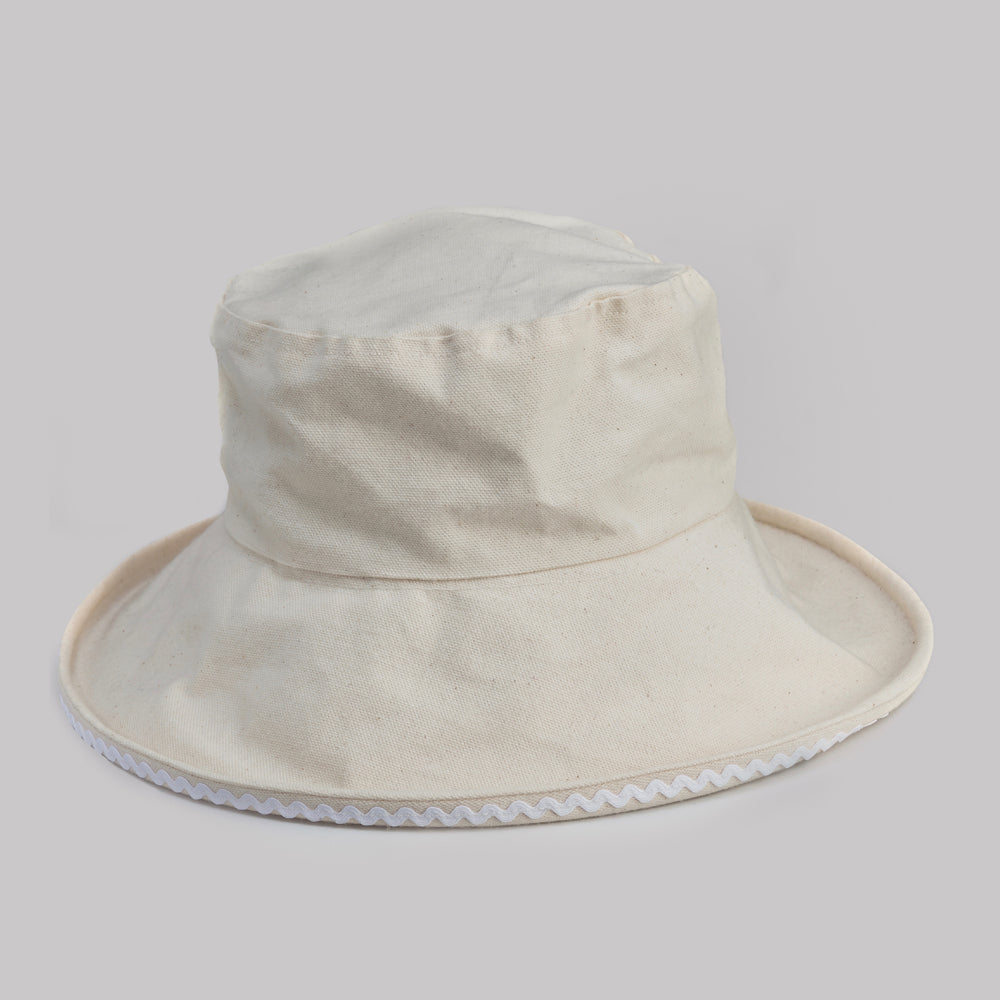 A beautiful classic wide brim shape, with Rik rack detail. The canvas used in our sunhats makes a lovely hard-wearing Hat. Handmade in Ireland and gives total UV total protection. It will last for years and always look stylish. Practical to wear on holiday at the beach or for a day in the garden..They can be rolled for easy travel.