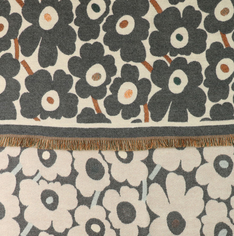 Grey and white reversible jacquard scarf with a poppy silhouette print