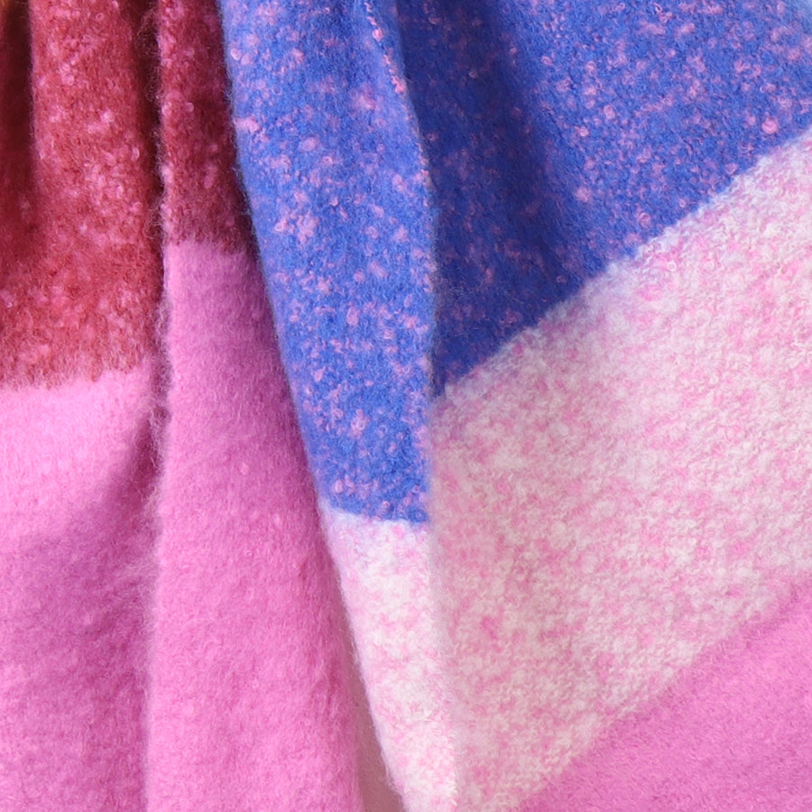 Soft woven recycled blend scarf with colour blocks in a pink and blue mix, finished with tassels at each end