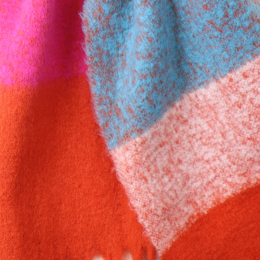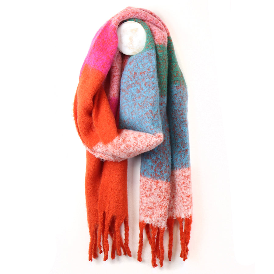 Soft woven recycled blend scarf with colour blocks in a red and aqua mix, finished with tassels at each end