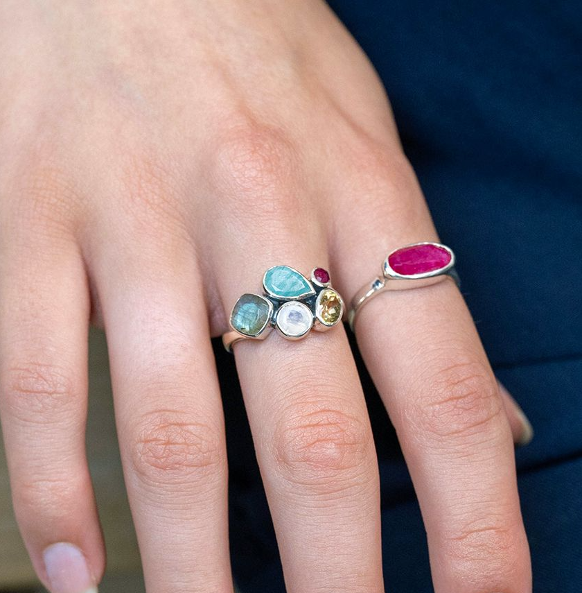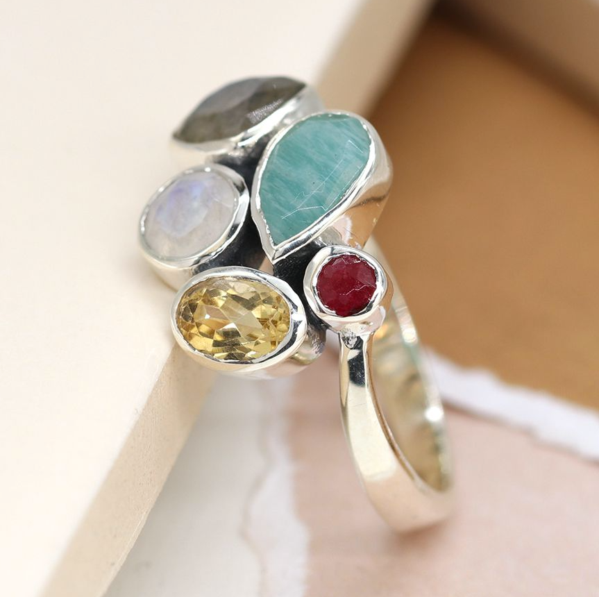 Description: Hand-crafted sterling silver multi-gemstone ring with ruby quartz, rainbow moonstone, labradorite, Citrine and amazonite.