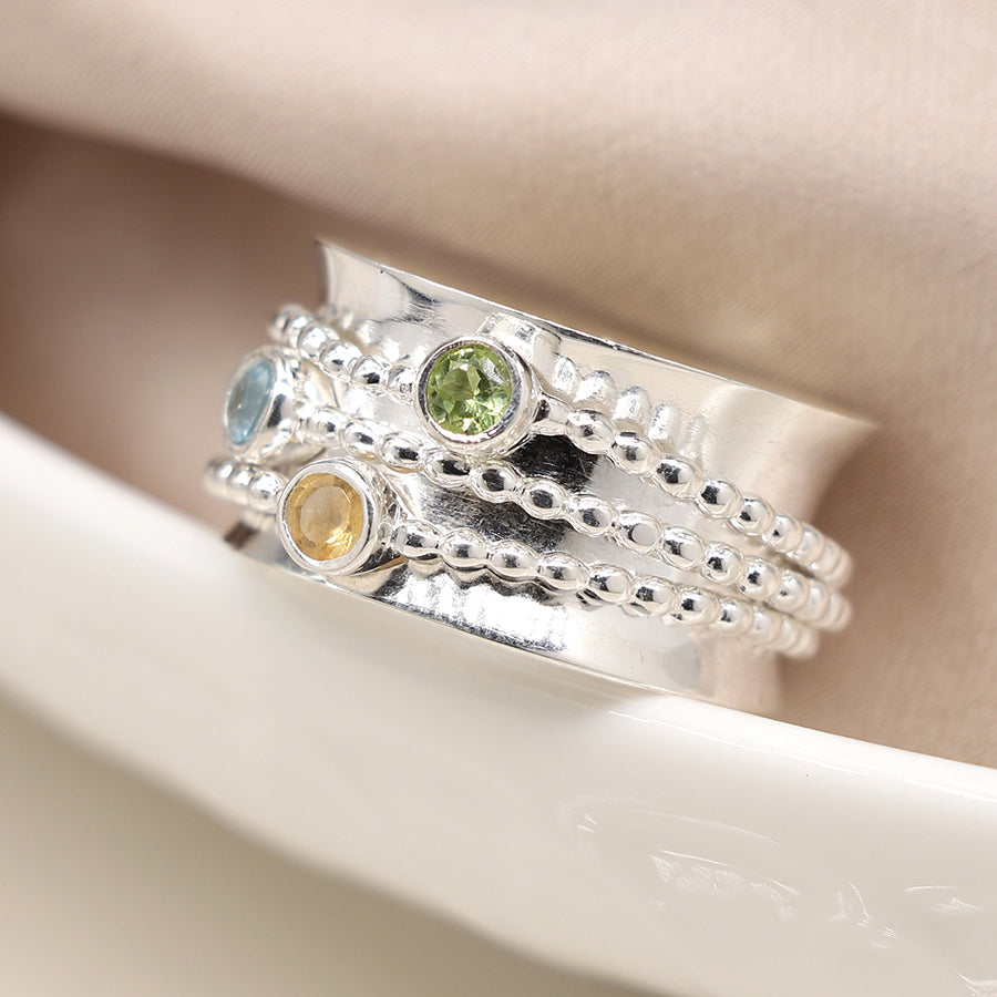 Sterling silver hand crafted spinning ring with triple moving dotted bands featuring mixed semi-precious gemstones