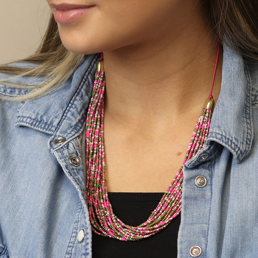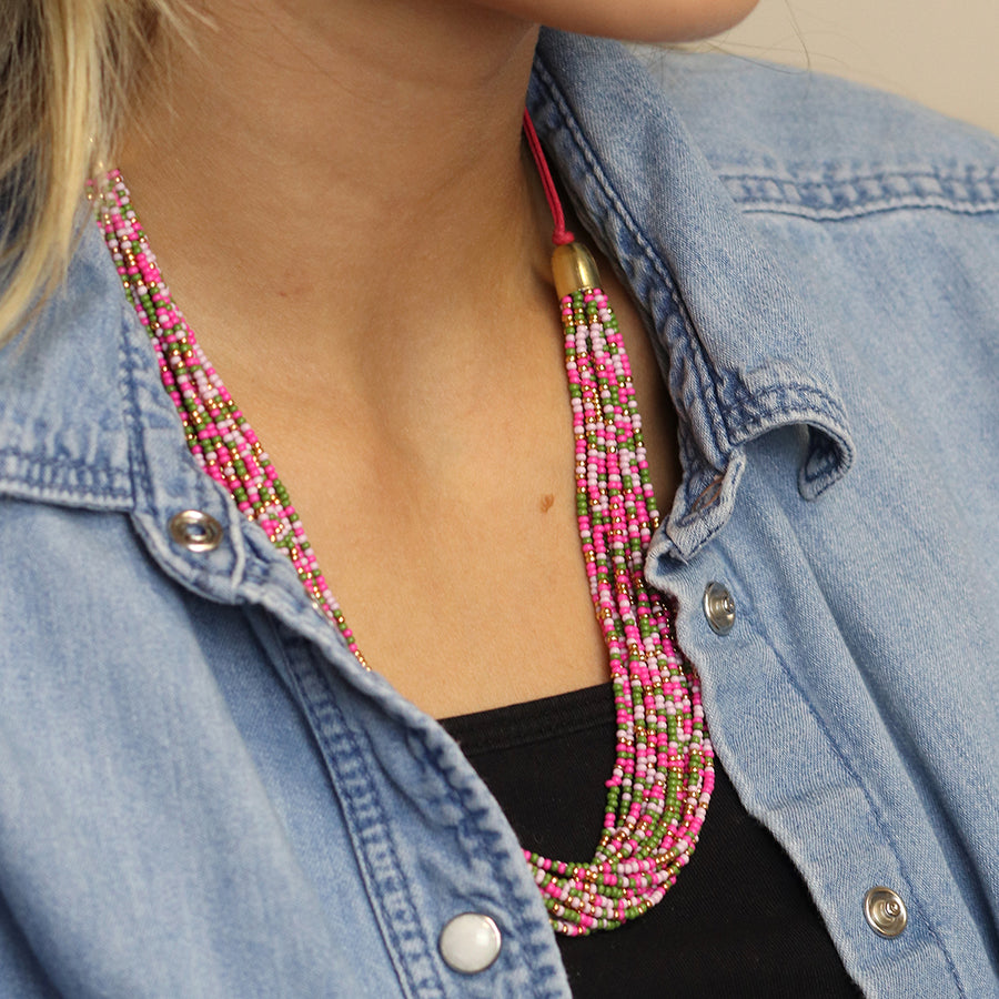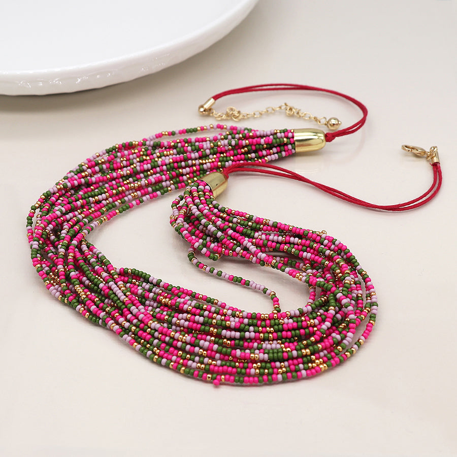 Description: Pink, mauve, olive and gold bead multi strand necklace with golden end caps, pink cord and golden lobster clasp fastening