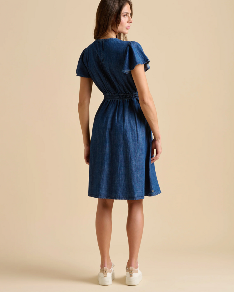 Our Sandsfoot dress is made from mid weight denim and packet with beautifully designed details. A soft “v” neck, pin tucks to the bodice, elasticated waist to the back, side seam pockets and butterfly sleeves. Soon to become your go to new season favourite.