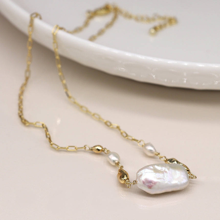 Faux gold plated fine chain necklace with organic shaped freshwater pearls and golden beads